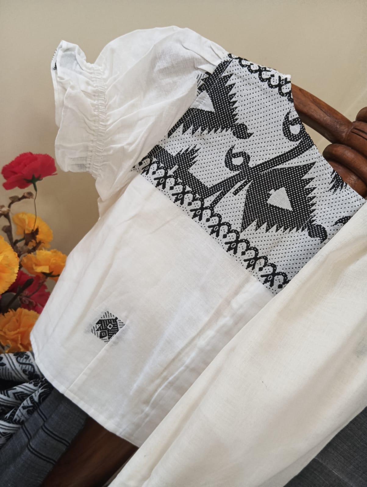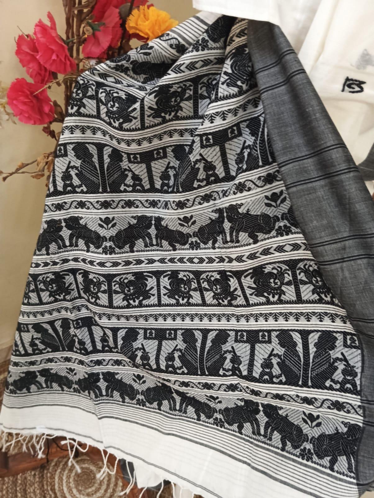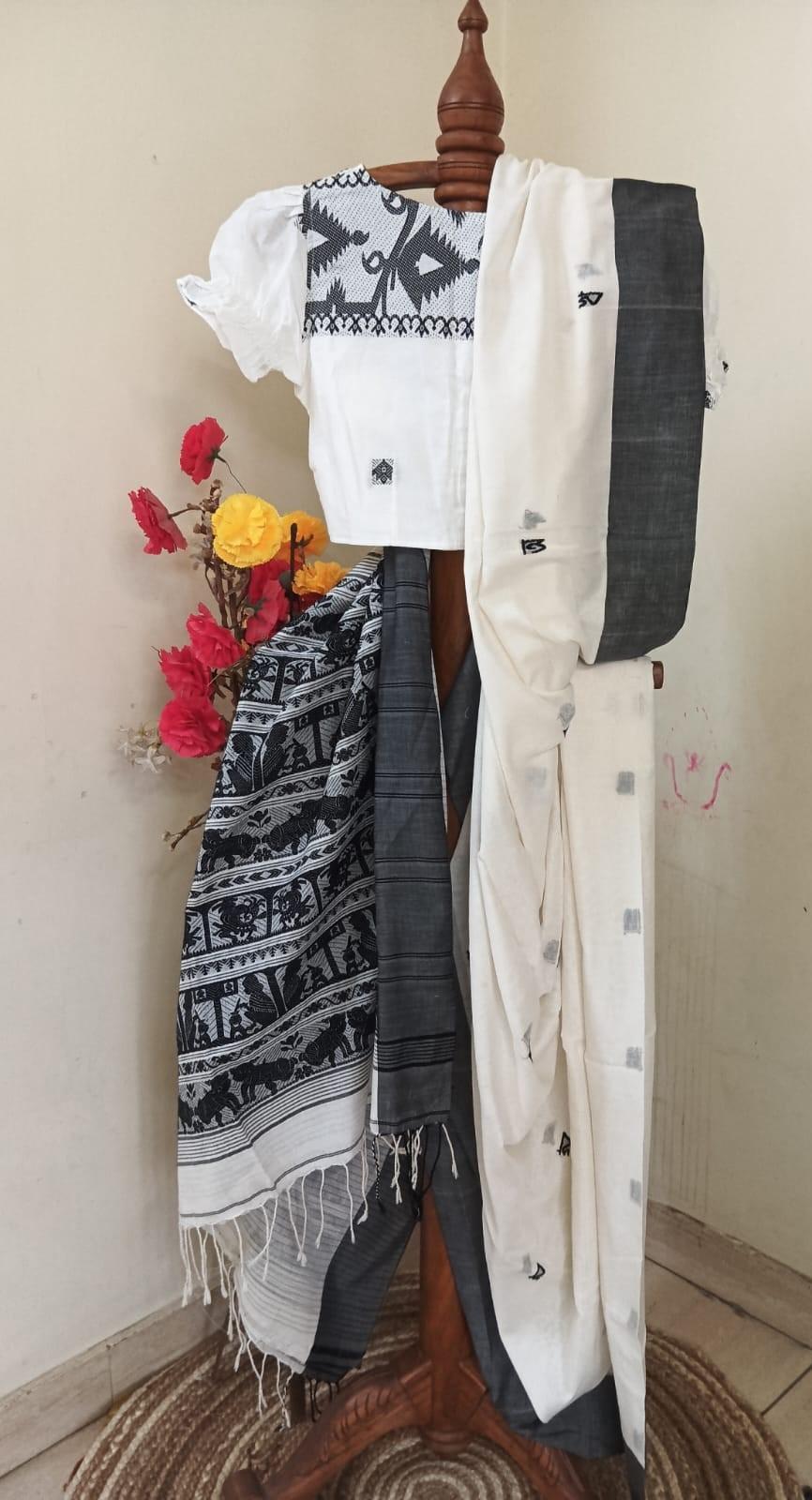 Elevate your wardrobe with the exquisite Baluchuri saree, a stunning blend of tradition and contemporary style. This striking piece features a captivating white and black color palette, adorned with intricate black and white patterns that tell a story of artistry and craftsmanship.